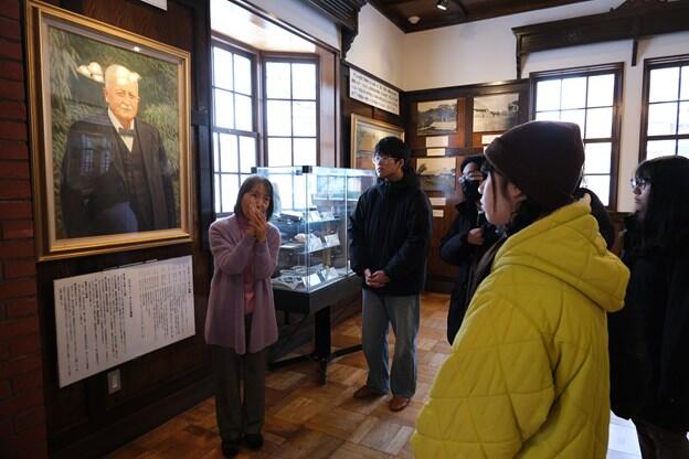 エドウィン・ダン(Edwin Dun、1848年7月19日 - 1931年5月15日)は、アメリカ合衆国の獣医師で明治期日本のお雇い外国人として北海道開拓使に雇用され、真駒内牧牛場の設立を指導するなど、北海道における畜産・酪農業の発展に大きく貢献しました。また後に外交官、実業家としても日本で活躍しました。こちらの記念館では、ダンの人生を描いた一木万寿三画伯による油絵や貴重な写真が解説とともに多数展示されており、大変見応えのあるものになっています。当日は寒さもあってか(?!)見学者は私たちだけで、スタッフの方から丁寧にご説明をいただけました。